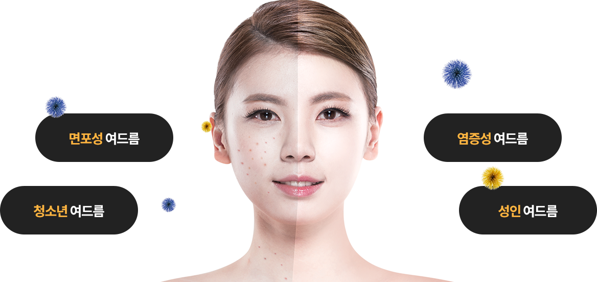 여드름은 모낭피지선 단위에서 발생하는 만성 염증성 질환으로 얼굴, 목, 등, 가슴 같이 피지선이 발달한 부위에서 발생하게 됩니다.