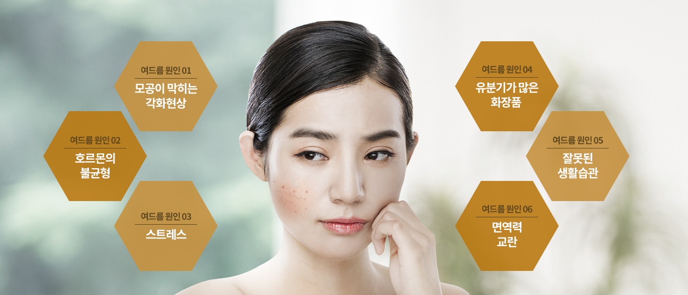 여드름 발생요인은 다양하지만 결국 피부 속 모낭에 부탁되어 있는 피지선의 피지과다분비와 피지배출부전으로 귀결되며,